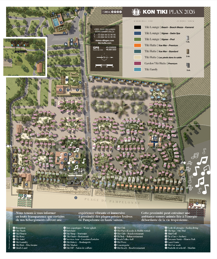 Bereidt u voor op het bruisende uitgaansleven van de nabijgelegen feestelijke stranden, waar de energie van de Golf van Saint-Tropez tot leven komt van eind juni tot begin september. Houd er rekening mee dat sommige van onze accommodaties af en toe wat geluidshinder kunnen ondervinden van deze levendige sfeer, wat hoort bij de wervelende drukte van Tropez. We doen er alles aan om de impact te minimaliseren en uw comfort te garanderen, gelijktijdig nodigen wij u uit om van deze wervelende sfeer te proefen, waarvoor onze bestemming bekend staat aan de Côte d'Azur. Wij nodigen degenen uit, die op zoek zijn naar een meer rustige omgeving, om te kiezen voor de minder blootgestelde zônes van ons park, door gebruik te maken van de optie ' My Tiki Hutte' of om de voorkeur te geven aan andere, minder feestelijke periodes.